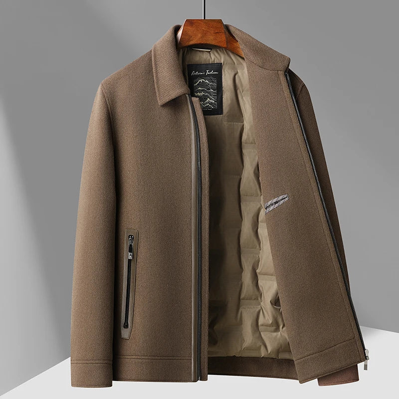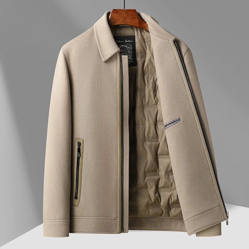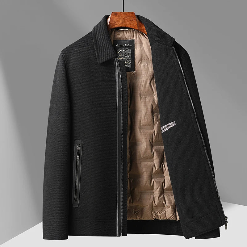 En tidløs frakke i uld med moderne raffinement. Den ribbede uldoverflade giver struktur og blødhed, mens regular fit sikrer et elegant udtryk i hverdagen. Læderdetaljer og en aftagelig dunforing tilpasser komforten efter årstiden – et alsidigt valg til kolde dage.