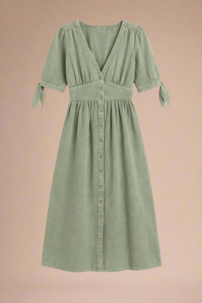 Lang kjole i vasket denim-look med dyb V-udskæring, antikke knapper og bindebånd på ærmerne. Det høje liv og den bløde A-form giver en flatterende silhuet, mens det slidte stof tilføjer kant og karakter. Et alsidigt design, perfekt til både hverdagsbrug med sneakers eller til aftenen med støvletter og accessories.
