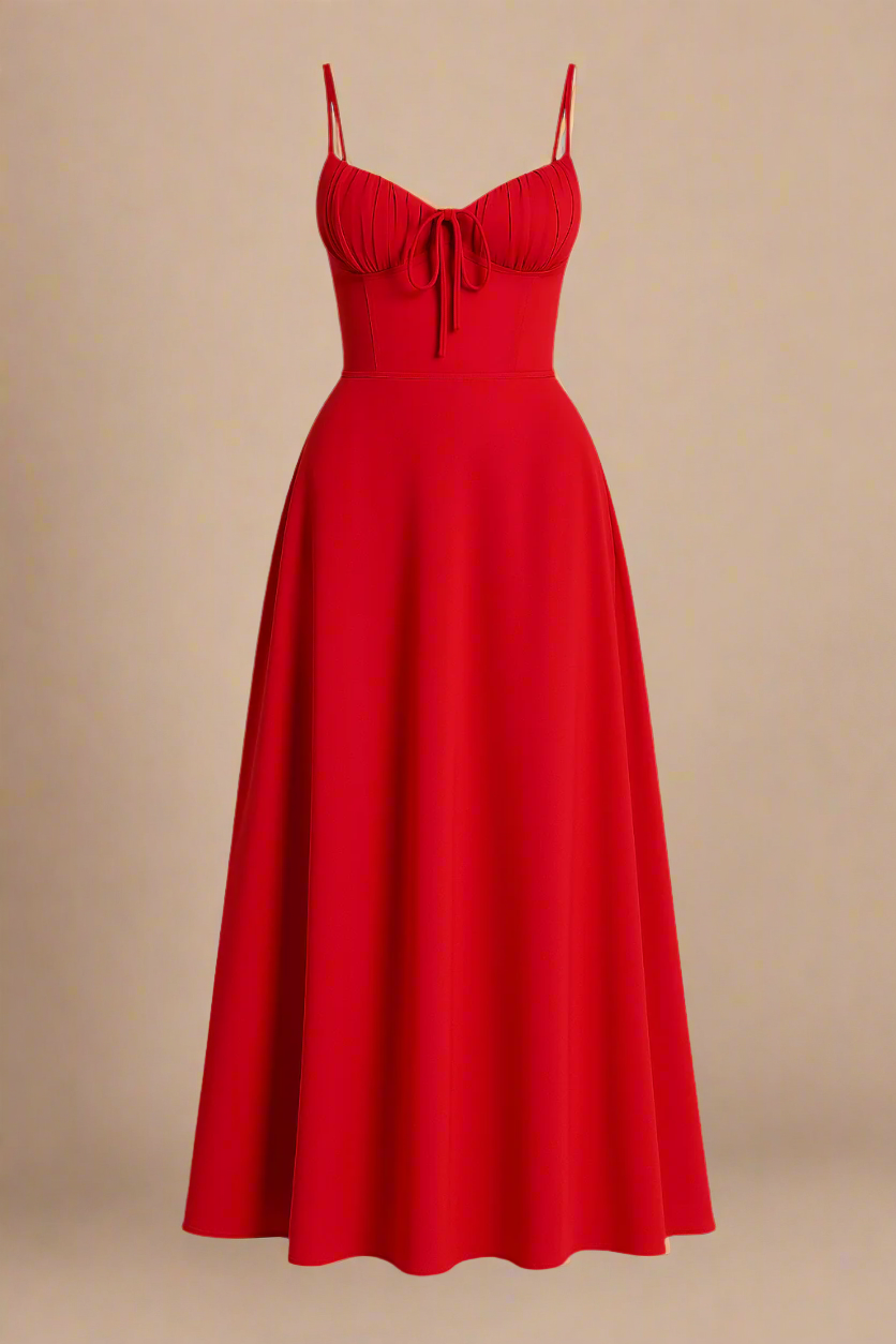 Elegant lang kjole med corsage-inspireret overdel og delikat rynkedetalje ved brystet. De tynde, justerbare stropper og det flydende fald skaber en feminin silhuet, der fremhæver figuren på en subtil og smigrende måde. Perfekt til fester, middage og særlige øjeblikke – style med hæle og smykker for et uforglemmeligt look.