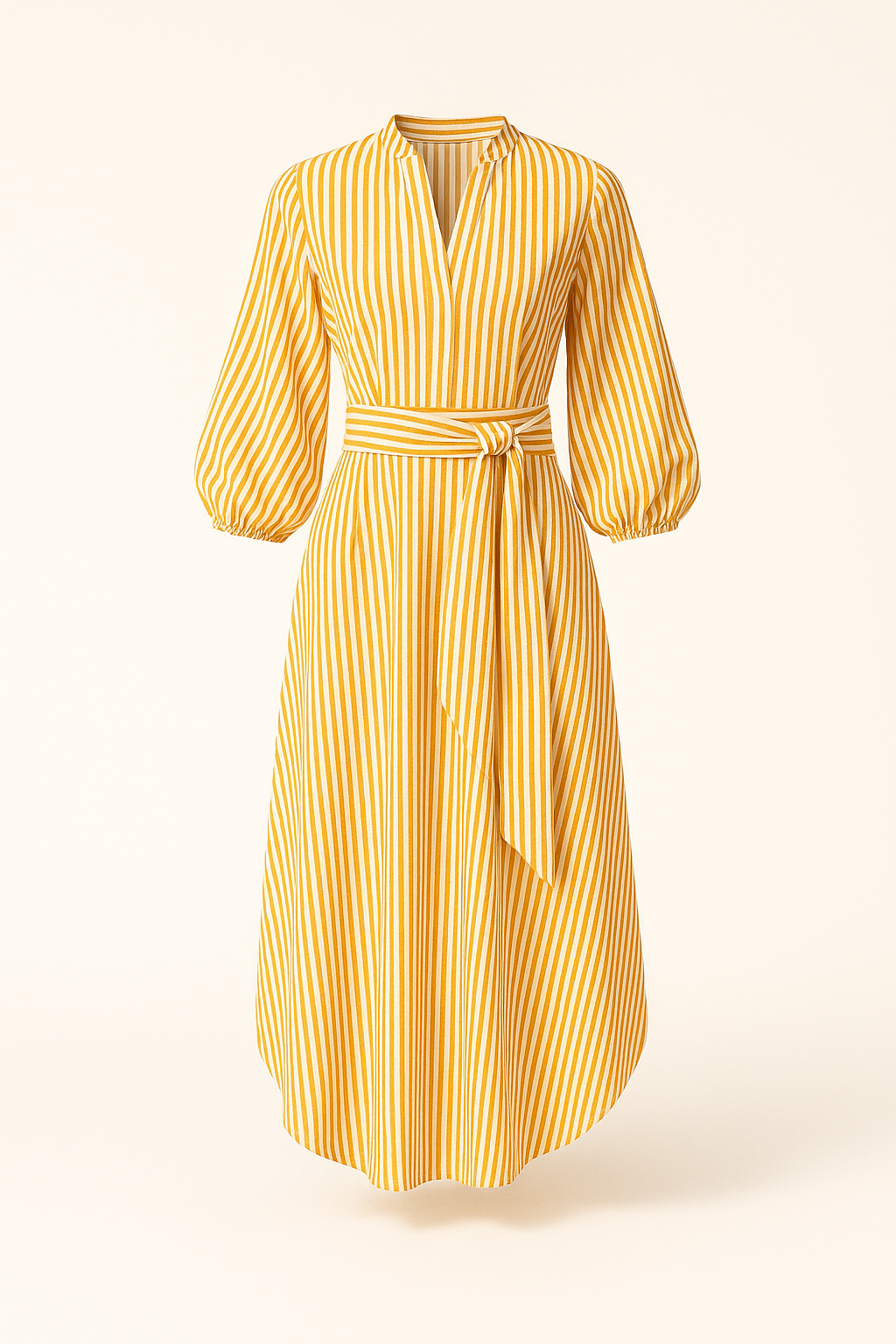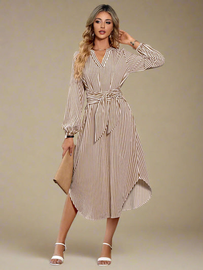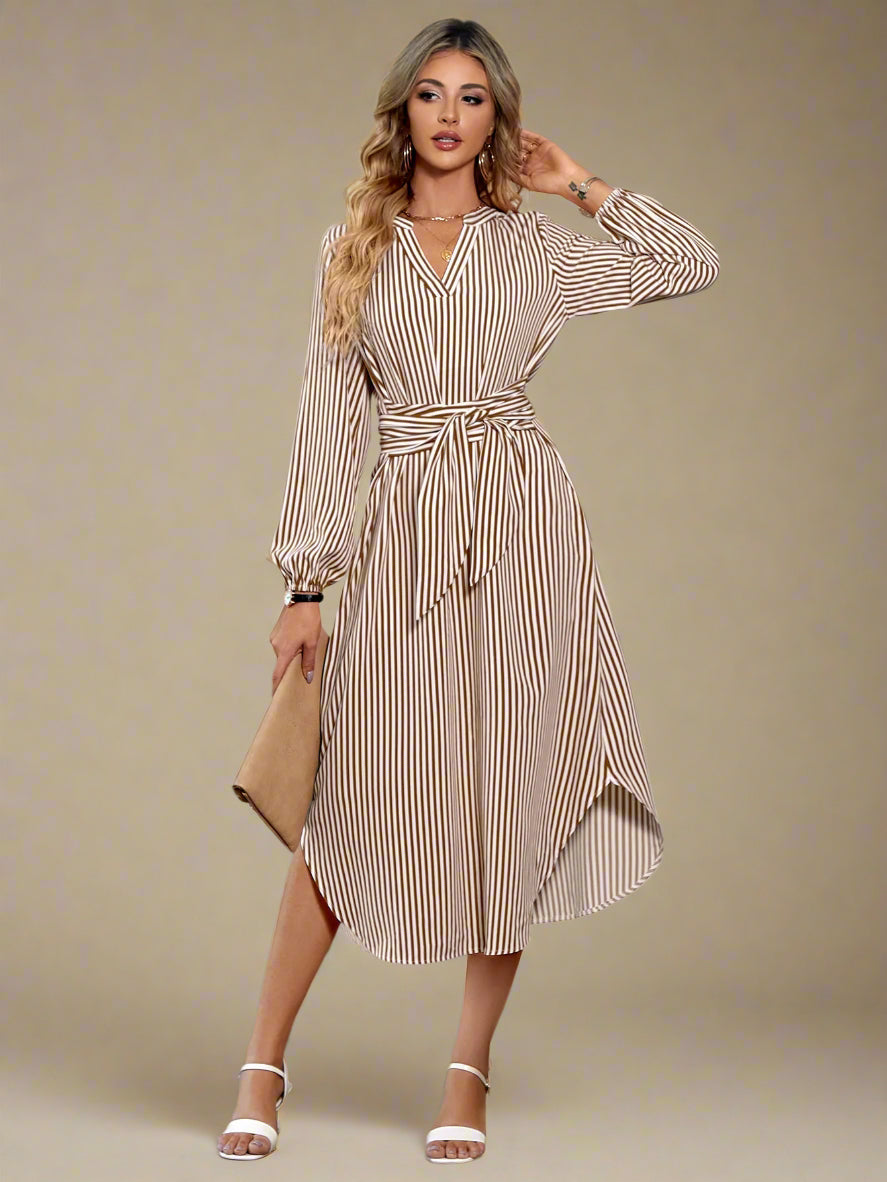Oplev en tidløs silhuet med Liv – en midi-kjole med elegante vertikale striber, bindebånd i taljen og ærmer med let volumen. Det lette stof og den afslappede pasform gør den perfekt til både hverdagsbrug og sommerlige begivenheder. Kombinér den med sandaler for et casual look, eller med hæle for et mere sofistikeret udtryk.