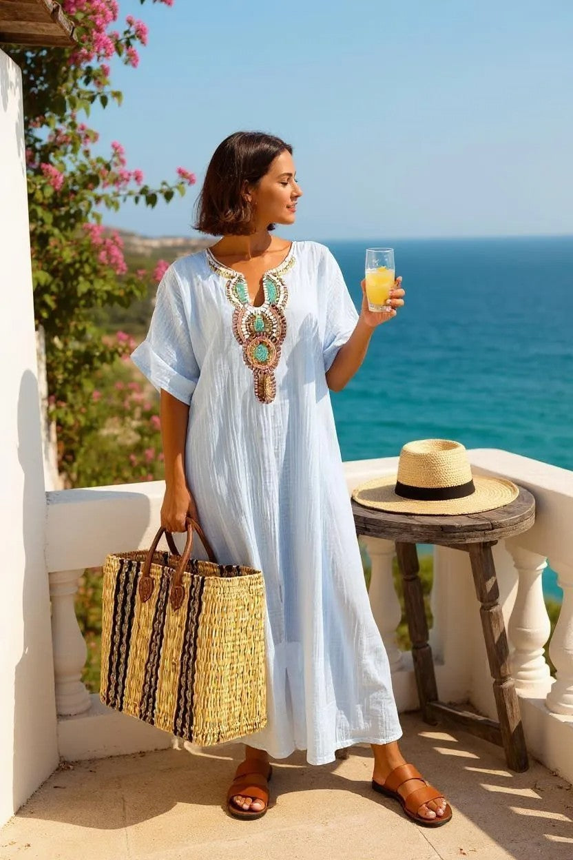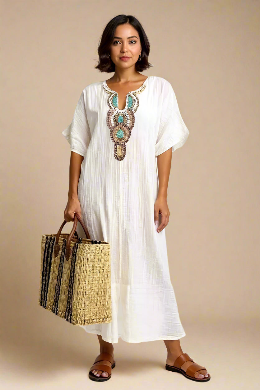 Denne kjole har en afslappet pasform og et let, luftigt fald, perfekt til både varme dage og afslappede øjeblikke. Den detaljerede udskæring tilføjer et eksotisk præg, og de små slidser i siden giver bevægelsesfrihed og kant.